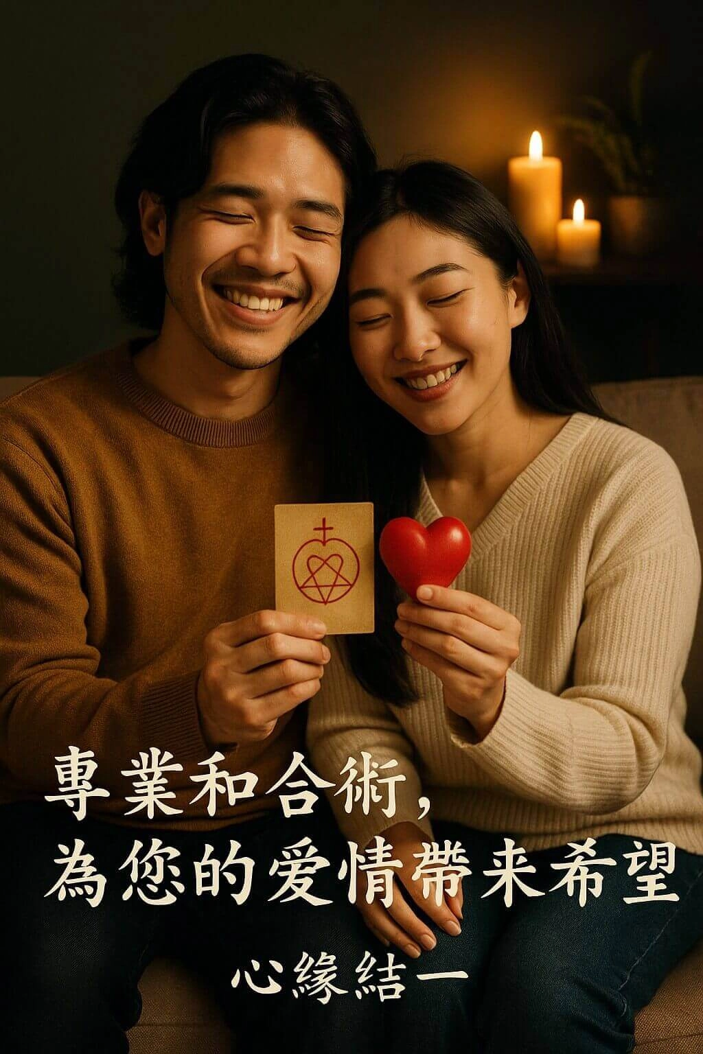 心緣結一的專業和合術服務,將幫助您修復感情中的裂痕,消除誤解,重建愛情的信任與和諧。立即聯繫我們,開始您的愛情修復之旅,讓愛重新回到正軌!