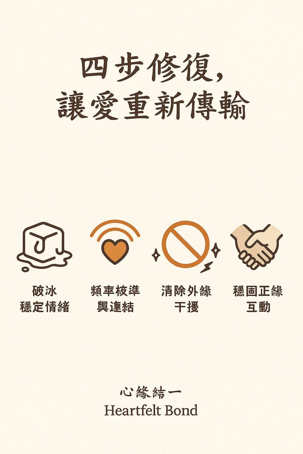 穩定雙方情緒磁場(去排斥): 透過雙心磁場穩合術,中和、消除長期爭吵累積的怨氣和疲憊。這是恢復溝通和親密感的前提。