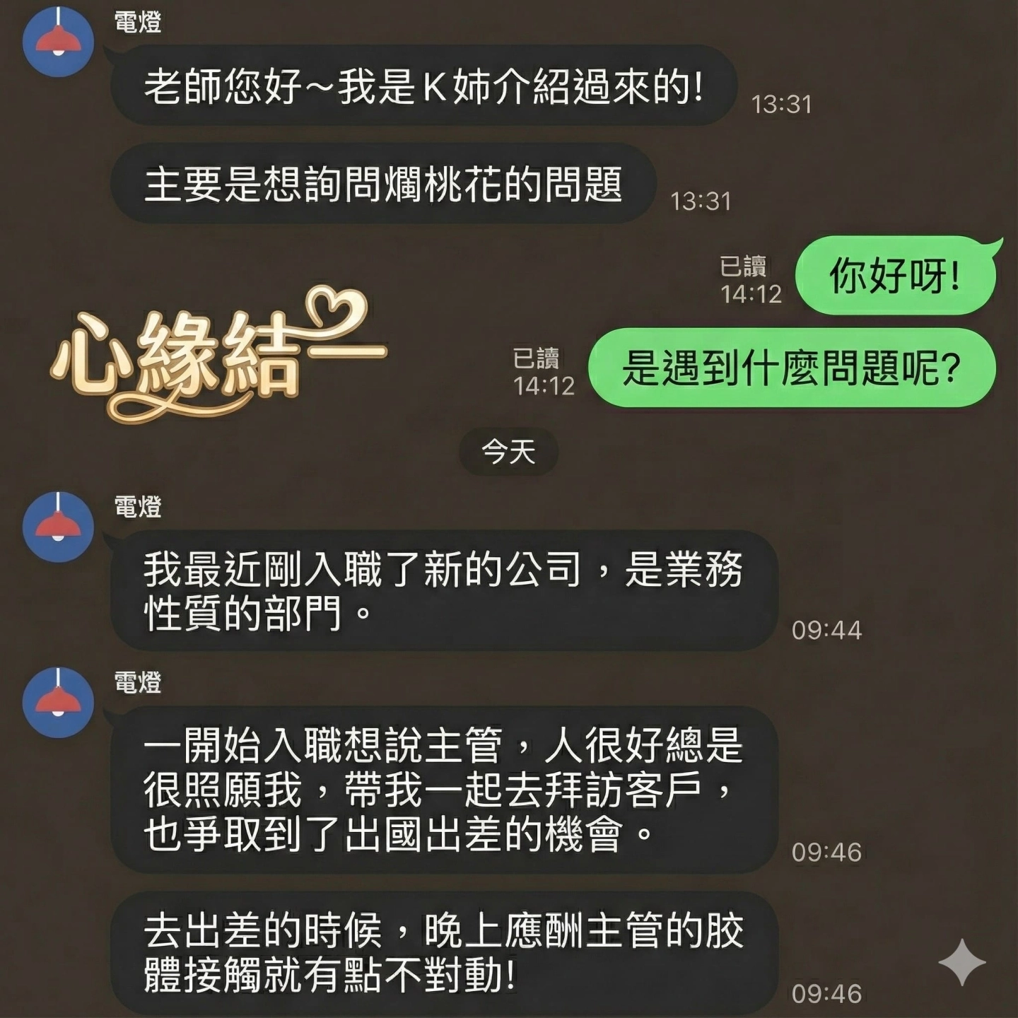 👇 [截圖 1.jpg:小潔初次諮詢,表示是K姊介紹,想詢問爛桃花問題]